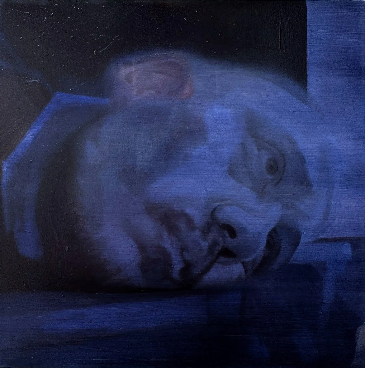 The image comes from a series of photographs I took of myself lying down on the ground—images that I have also shared publicly on my Instagram and in the Cane Yo public (and less public) reference chats—and that have spawned tons of amazing artwork from other fellow artists. My face happens to look a bit sad and defeated when I am at rest. I feel like that is a very attractive feature for artists who work with themes of melancholy, loneliness, and alienation—and of course, I am one of those folks. I have made other versions of this same theme (a head that rests on the ground looking defeated), and I first had the idea of using this image as an oil painting earlier this year (a piece I titled “Doomscrolling”), which initially was to feature a plant growing from my ear canal. However, when I was finishing “Doomscrolling,” I decided that it wasn’t necessary for that piece. I also felt that due to the size of the piece, maybe the addition of the plant would feel forced and too much. So I decided to resolve it by replacing the plant with a hint of red and pink in the ear that is barely visible because of the deep purple atmosphere of that painting.